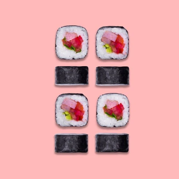 Рис, нори, соус чесночный, тунец жареный, лук зеленый, томат.