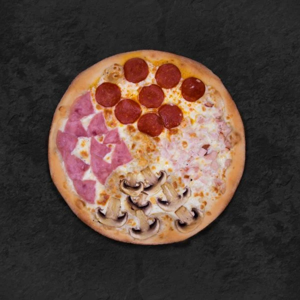 Соус чесночный, сыр моцарелла, кочёная куриная грудка, ветчина, пепперони, шампиньоны.