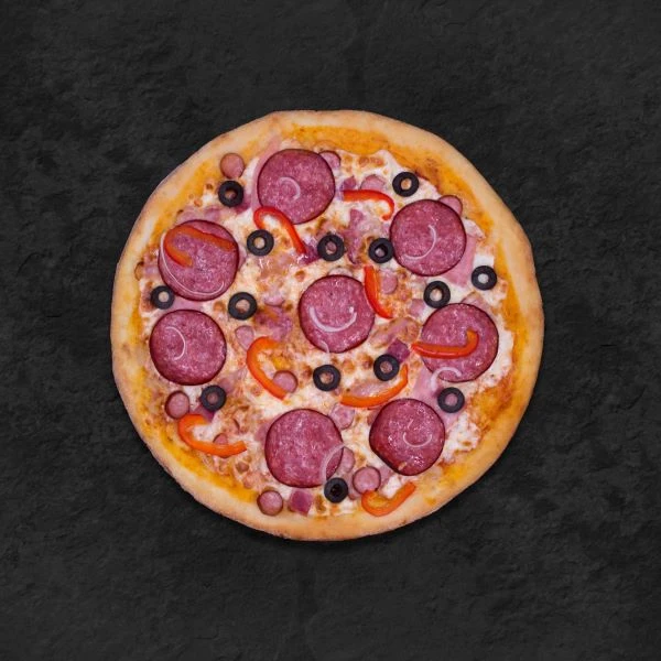 Соус томатный, сыр моцарелла, бекон. охотничьи колбаски, ветчина, салями, пец болгарский, лук репчатый, маслины.