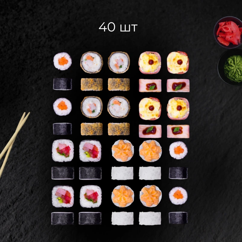 40шт - Нагахама (рис, нори, сыр творожный, куриное филе копченое, бекон, майонез, сыр моцарелла, лук зеленый, унаги соус) - Сайтама (рис, нори, форель, сыр творожный, креветка, лук зеленый, кляр темпура, сухари) - В кунжуте с жареным лососем (рис, нори, лосось, сыр творожный, огурец, кунжут) - С лососем (рис, нори, лосось) - Вулкан (рис, нори, форель, лук зеленый, соус вулкан) соус соевый 2шт имбирь 1шт васаби 1шт палочки 2 пары