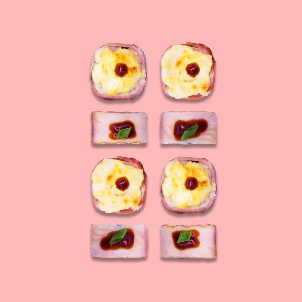 Рис, нори, сыр творожный, копчённая куриная грудка, лук зеленый, бекон, майонез, сыр моцарелла, унаги соус.