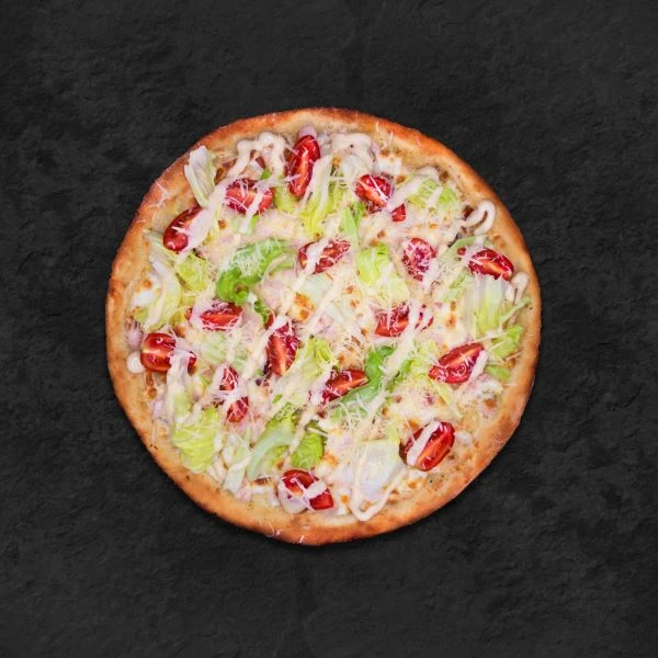 Соус чесночный, сыр моцарелла, кочённая куриная грудка, томаты, салат айсберг, соус цезарь, сыр пармезан.