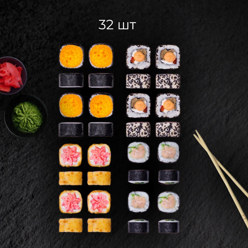 32 шт. - Акита (рис, нори, омлет томаго, сыр кремете, перец болгарский, кунжут, спайс соус.) - Хасима (рис, нори, водоросли чука, кунжутно-ореховый соус.) - Чикусей (рис, нори, куриное филе копченое, сыр творожный, сырная шапка.) - Нобеока (рис, нори, сыр творожный, огурец свежий, куриное филе копченое, сухари панировочные, соус лава.) совый 2шт имбирь 1шт васаби 1 шт палочки 2шт.