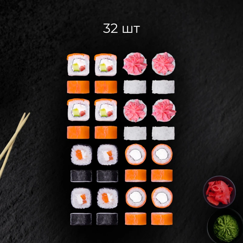 32шт - Филадельфия (рис, нори, сыр творожный, форель) - Токи (рис, нори, сыр творожный, помидор, огурец, форель) - Лава (рис, нори, сыр творожный, форель, соус лава) - Сливочный лосось (рис, нори, сыр творожны, лосось) соус соевый 2шт имбирь 1шт васаби 1шт палочки 2шт