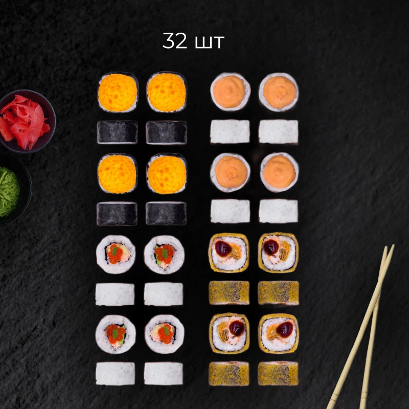 32 шт. - Чичибу (рис, нори, грудка куриная копченная, луковые чипсы, огурец свежий, соус спайс.) - Хоки (рис, нори, крем-краб, авокадо, икра красная имитация, лук зеленый свежий.) - Симода (рис, нори, омлет томаго, крем-краб, куриное филе копченое, сухари панировочные, соус унаги.) - Чикусей (рис, нори, куриное филе копченое, сыр творожный, сырная шапка.) соевый 2шт имбирь 1шт васаби 1шт палочки 2шт.