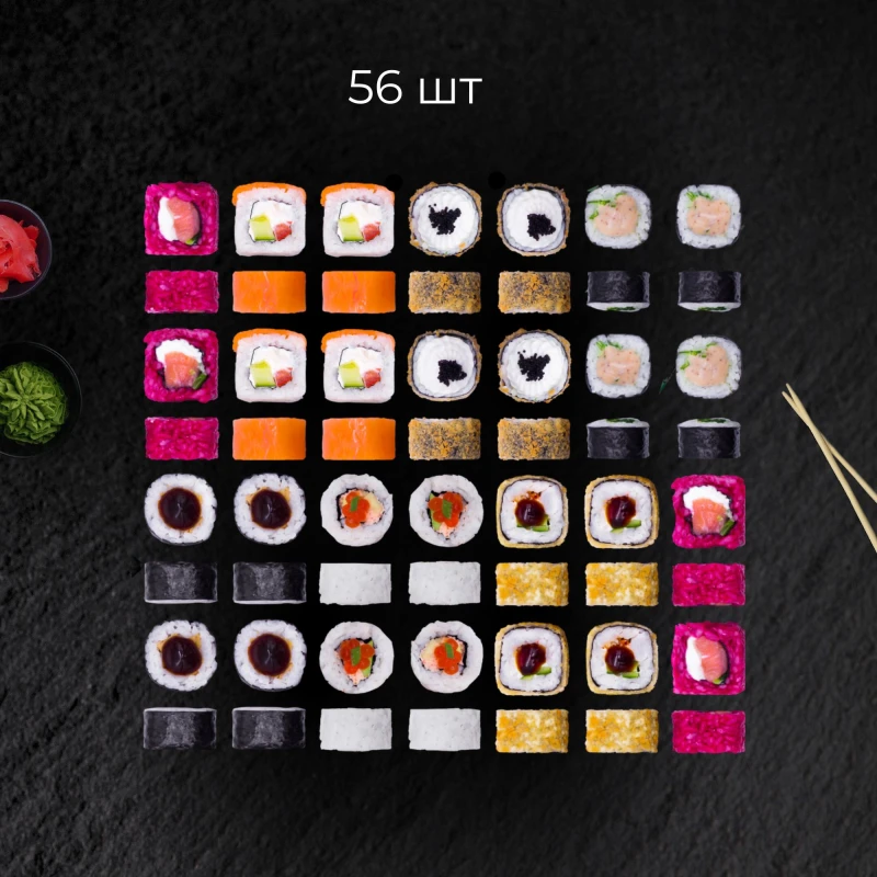 56шт - Токи (рис, нори, сыр творожный, форель свежая, томат, огурец) - Бостон ( рис, сок свеклы, нори, сыр творожный, форель свежая, лук зеленый) - Хоки (рис,нори, крем-краб, авокадо, икра имитированная, лук зеленый) - Якушима (рис, нори, снежный краб, водоросли чкуа, кляр, сухари панировачные, сливочный крем, икра масаго) - Кадзуно (рис,нори, сыр творожный, угорь, креветки, огурец, кляр, сухари панировачные, унаги соус) - Хасима (рис,нори, водоросли чука, кунжутный сокс) - Товада (рис,нори, омлет томаго, унаги соус) Соевый соус 2 порции. Имбирь 1 порция. Васаби 1 порция Палочки бамбуковые 2 пары.