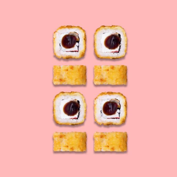 Рис, нори, сыр творожный, угорь. снежный краб, кляр, сухари панировачные, соус унаги.